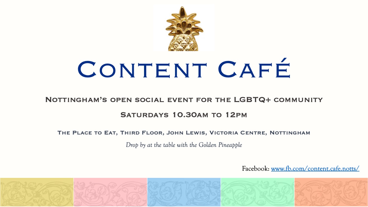 Content Café aims to be a welcoming and safe social space in Nottingham for people who are LGBTQ+. It’s the only open event of its kind in Nottingham: a central place to meet new friends and chat. Running weekly since February 2024, you can drop in any time between 10:30am and 12pm. From 30th Aug 2025, the venue will be John Lewis & Partners, (Place to Eat, 3rd Floor) Victoria Centre, Nottingham, which offers a wide range of refreshments